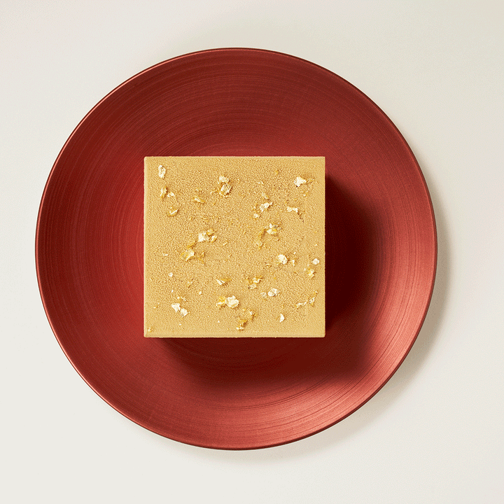 土台には、フランスの古典菓子であるパン・ド・ジェンヌを。紅抹茶、北海道の甜菜糖、刻んだアーモンドを合わせ、食感豊かに仕立てています。ナッティな風味は、ミルクティーテイストのガナッシュと好相性。表面には粉雪のようにカカオバターをコーティングし、トップには金箔を散らすことで、より一層リュクスなビジュアルに。ナイフを入れれば、美しいグラデーションが現れます。「紅抹茶(あかまっちゃ)」や「紅富貴(べにふうき)」を連想させる真紅ボックスとのコントラストも秀逸。